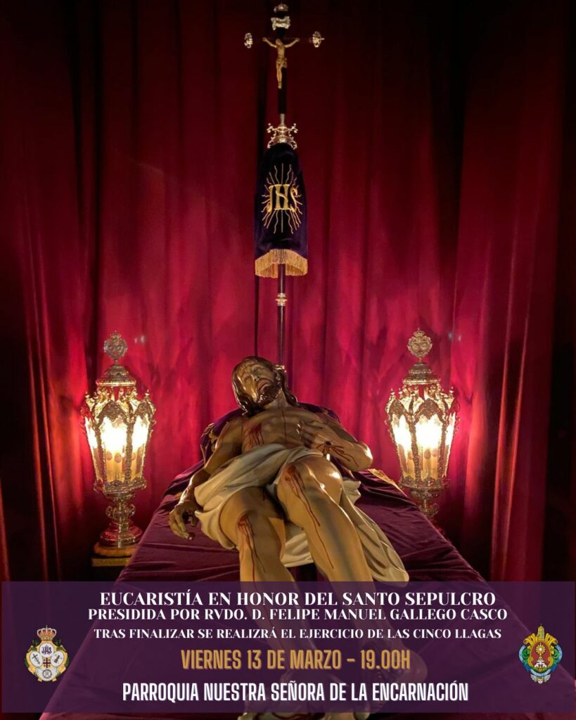El próximo viernes 13 de marzo tendrá lugar la Eucaristía en honor al Santo Entierro, presidida por el reverendo párroco don Felipe Gallego Casco, director espiritual de la Archicofradía.