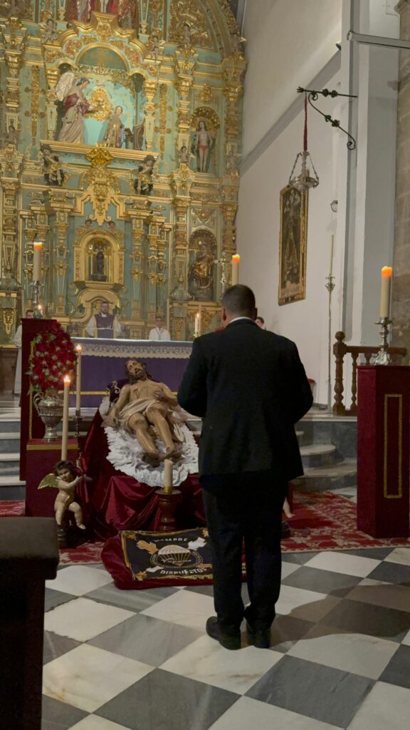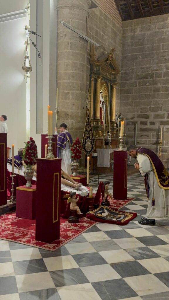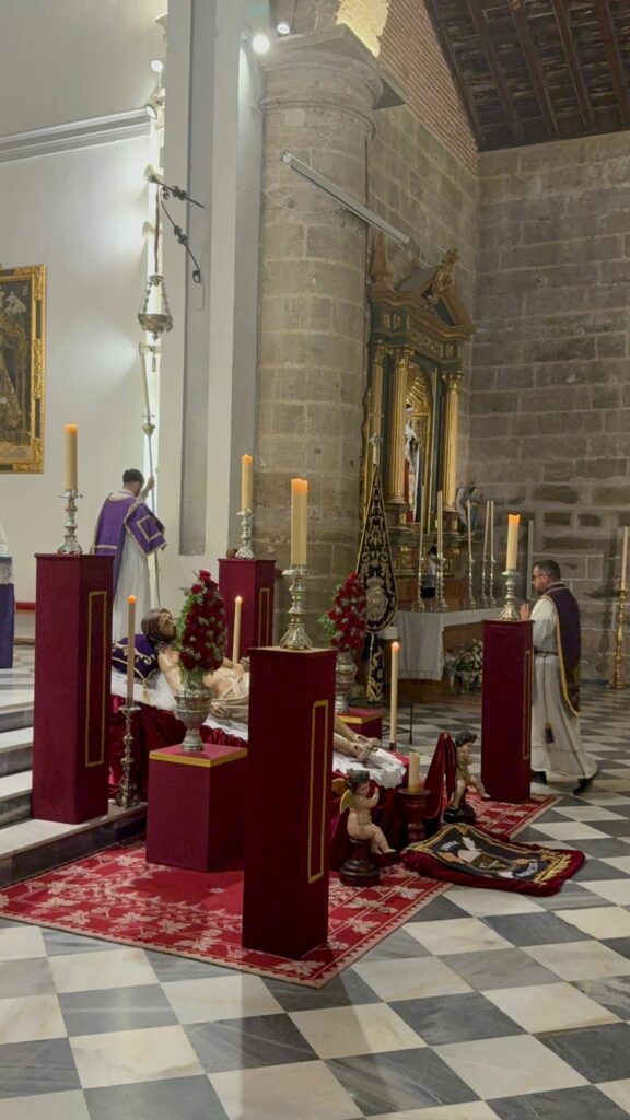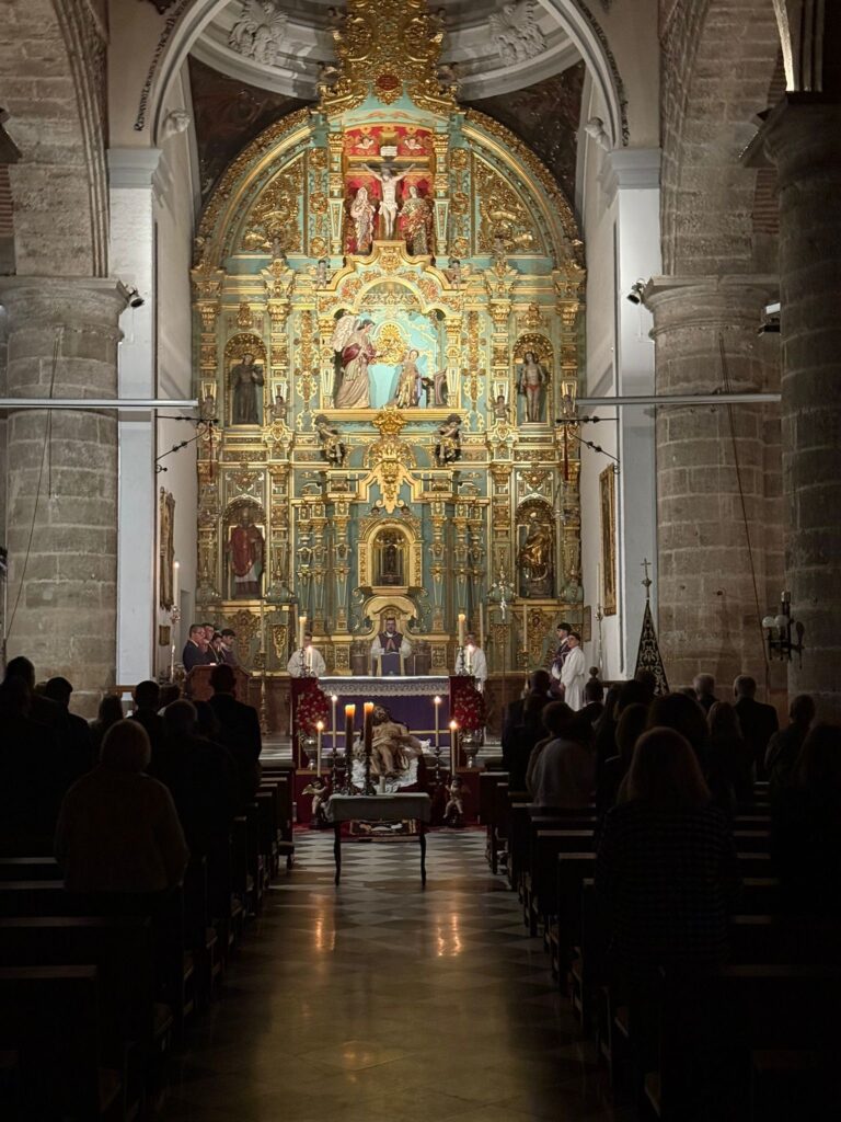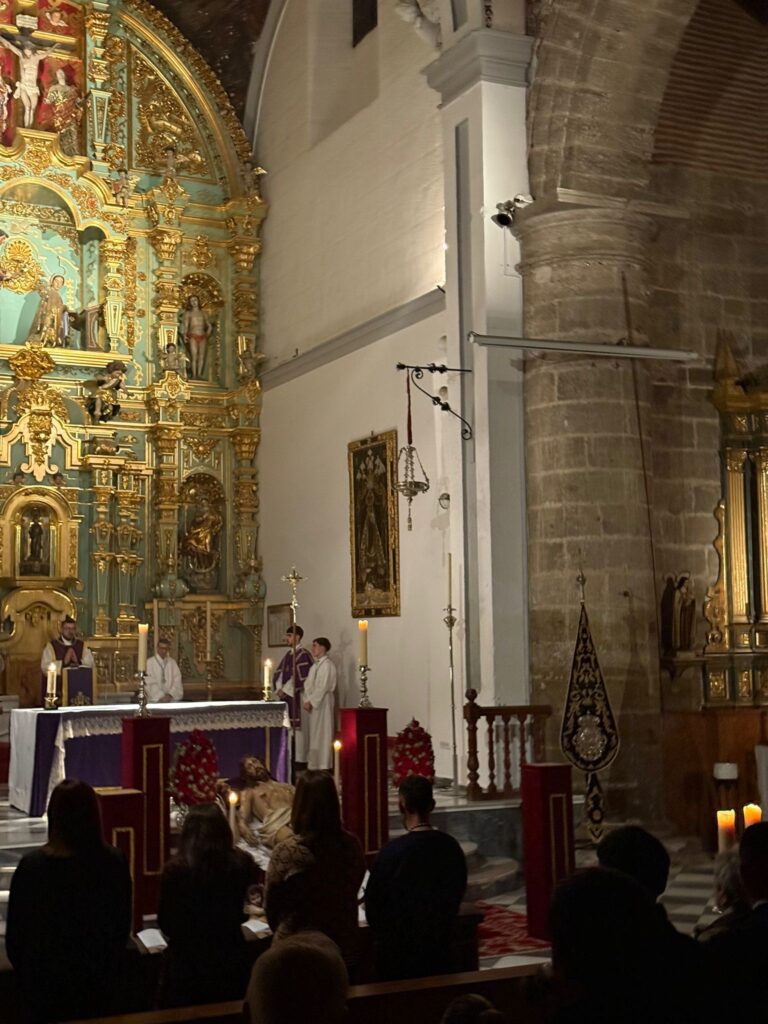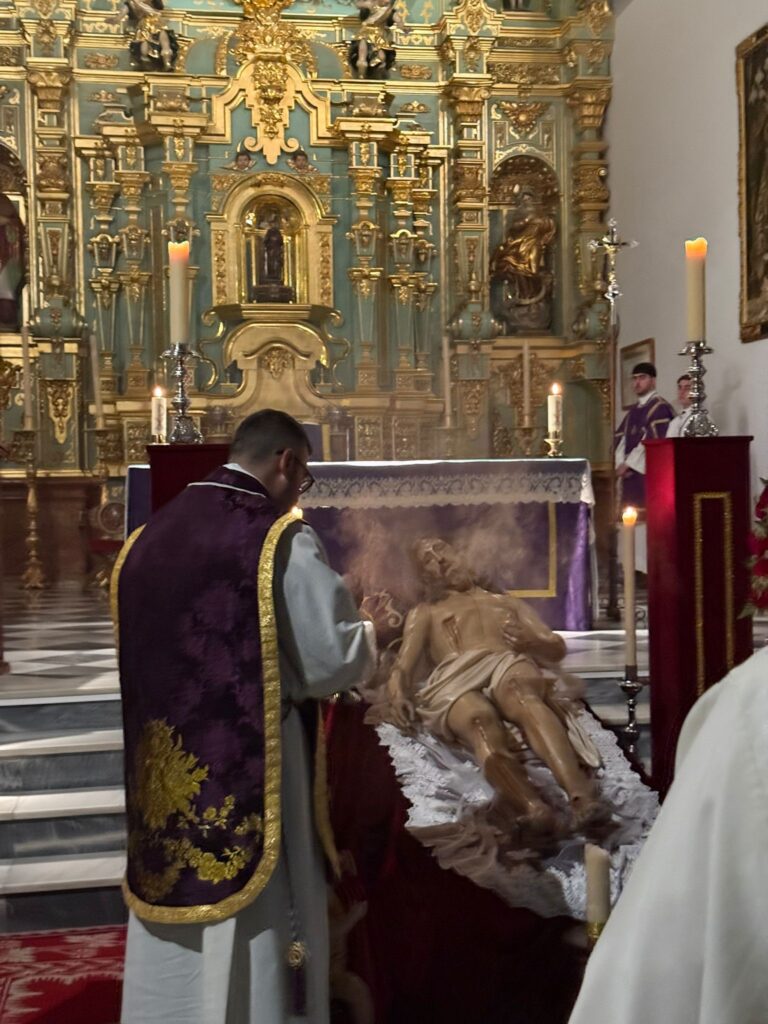 La imagen del Santo Entierro ocupó el lugar central del templo, delante del altar mayor, preparada para la ocasión en un altar dispuesto con sobriedad y solemnidad. Su presencia evocaba el momento en que el cuerpo de Cristo, ya descendido de la cruz, es entregado a sus discípulos y preparado para su sepultura. Se trata de una escena cargada de significado dentro del relato de la Pasión, pues representa el instante de silencio que sigue al sacrificio y que precede al triunfo de la resurrección.