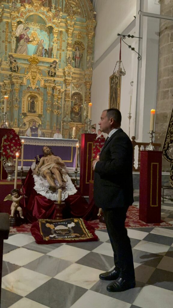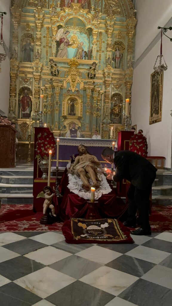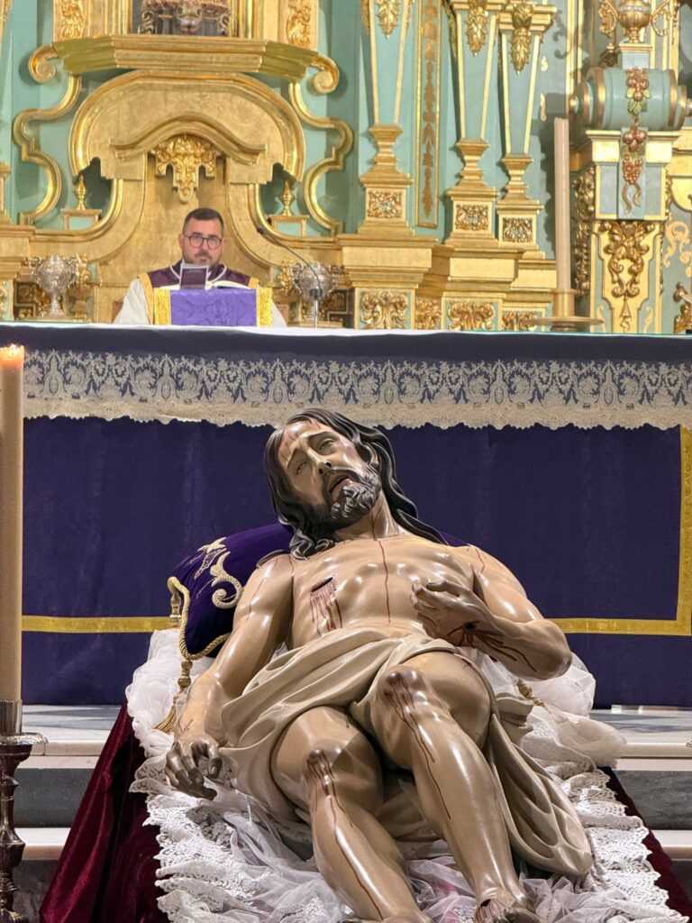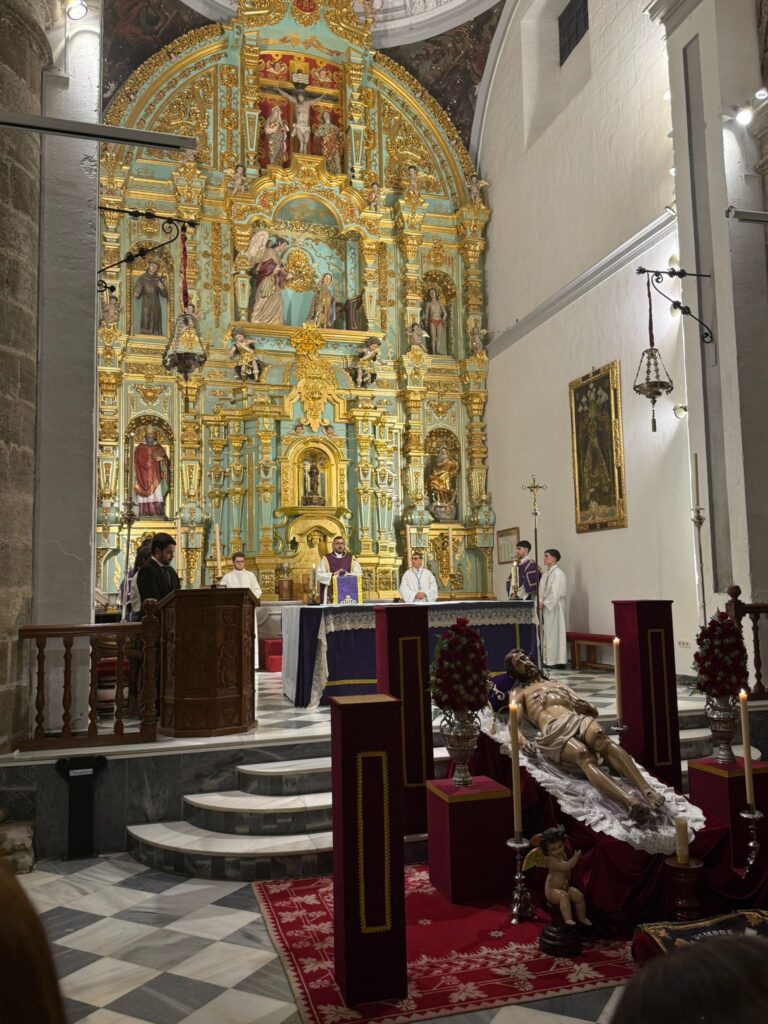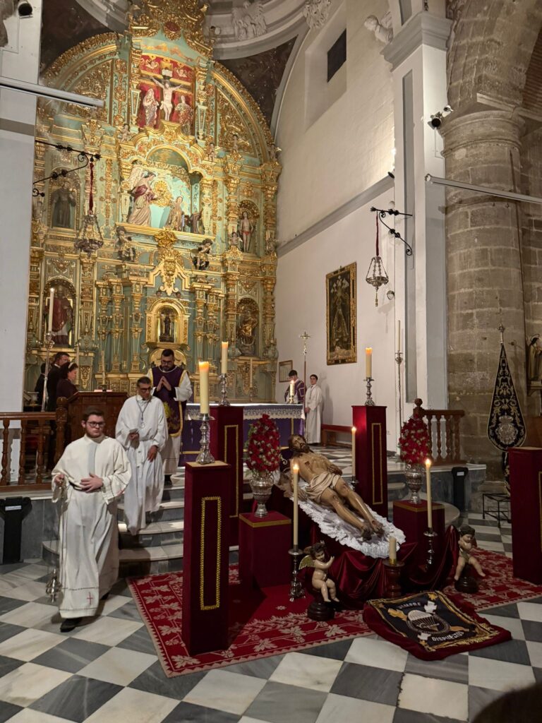 El culto estuvo centrado en el ejercicio de las Cinco Llagas, una práctica devocional profundamente arraigada en la tradición de la Iglesia y que invita a los fieles a meditar sobre las heridas que Jesucristo recibió durante su crucifixión. La Santa Misa fue presidida por nuestro Parroco y Director Espiritual don Felipe Manuel Gallego Casco, quien acompañó espiritualmente a los presentes en este momento de reflexión y oración. Además, estuvo debidamente representada VEPAMA, los cuales son padrinos de nuestra Sagrada imagen desde su bendición.