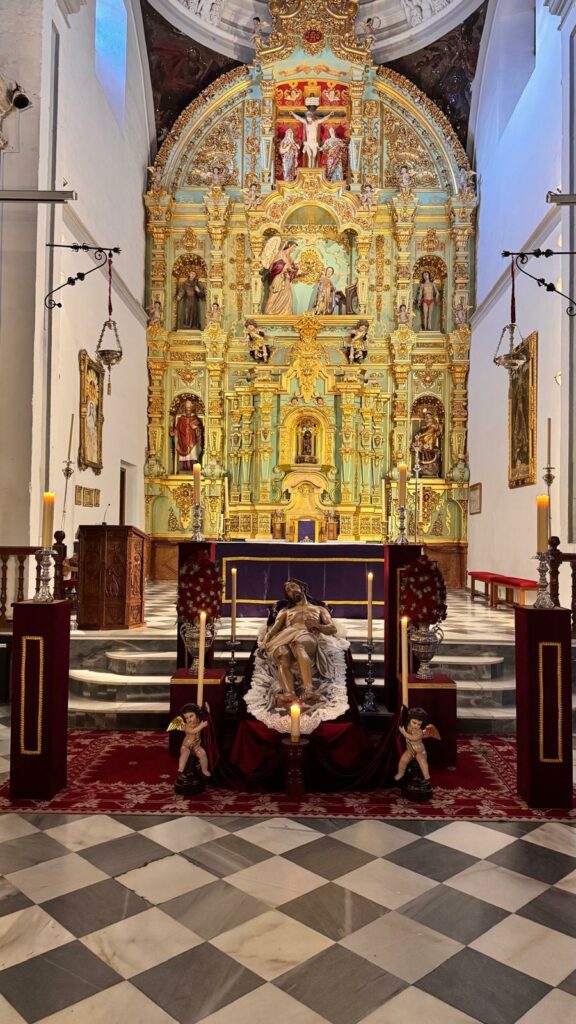 La imagen del Santo Entierro ocupó el lugar central del templo, delante del Altar Mayor, preparada para la ocasión en un altar efímero dispuesto con sobriedad y solemnidad. Su presencia evocaba el momento en que el cuerpo de Cristo, ya descendido de la Cruz, es entregado a sus discípulos y preparado para su sepultura. Se trata de una escena cargada de significado dentro del relato de la Pasión, pues representa el instante de silencio que sigue al sacrificio y que precede al triunfo de la resurrección.