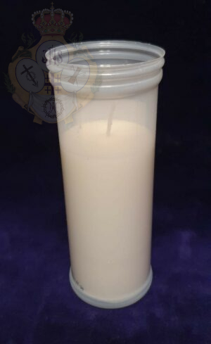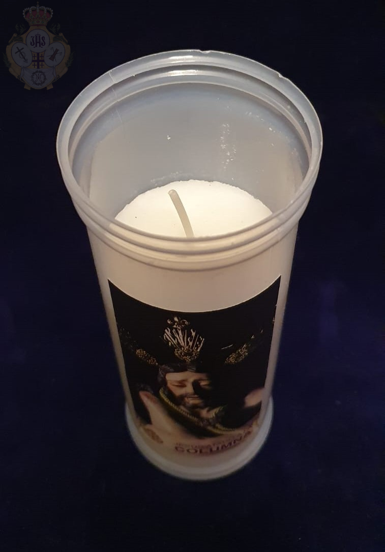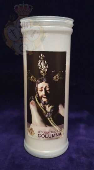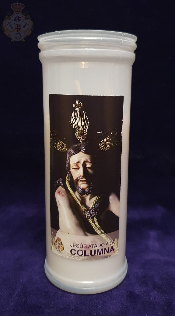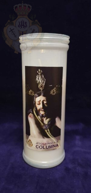 Vela grande con la imagen de Jesús Atado a la Columna. Tamaño: 16 cm alto – 6 cm ancho.
