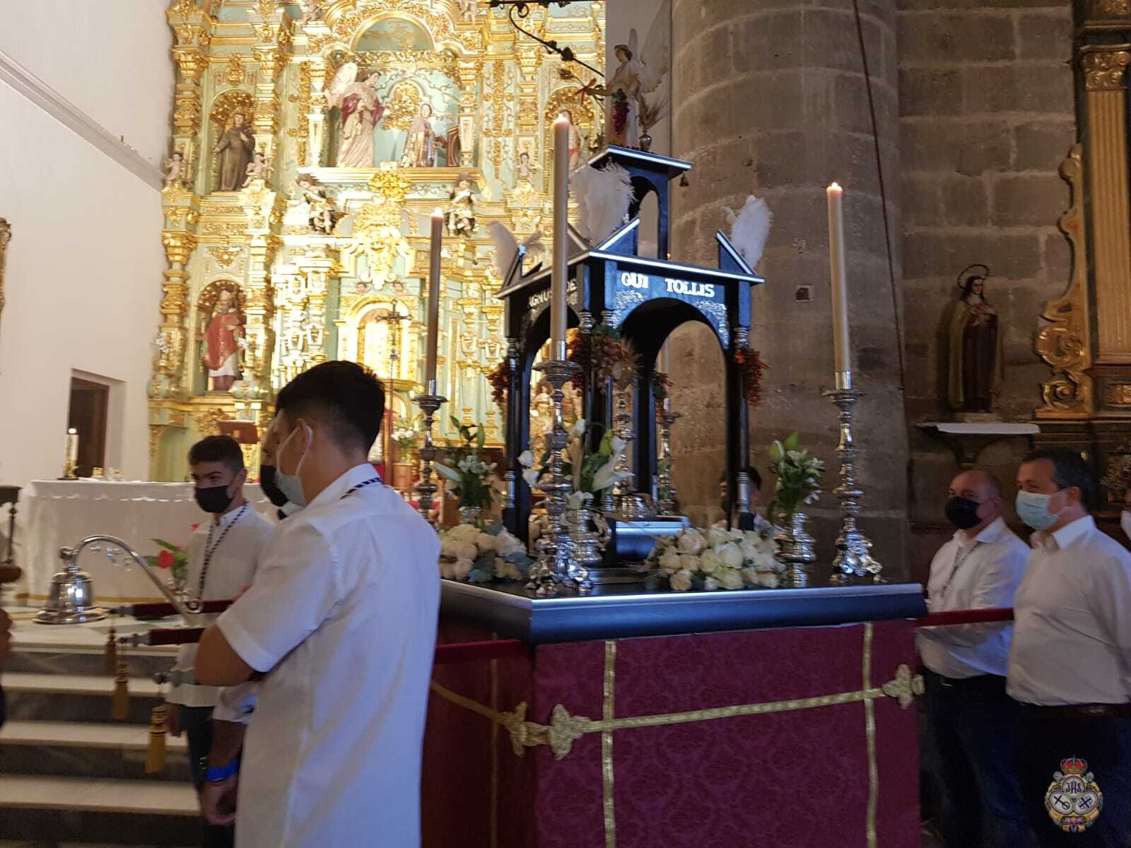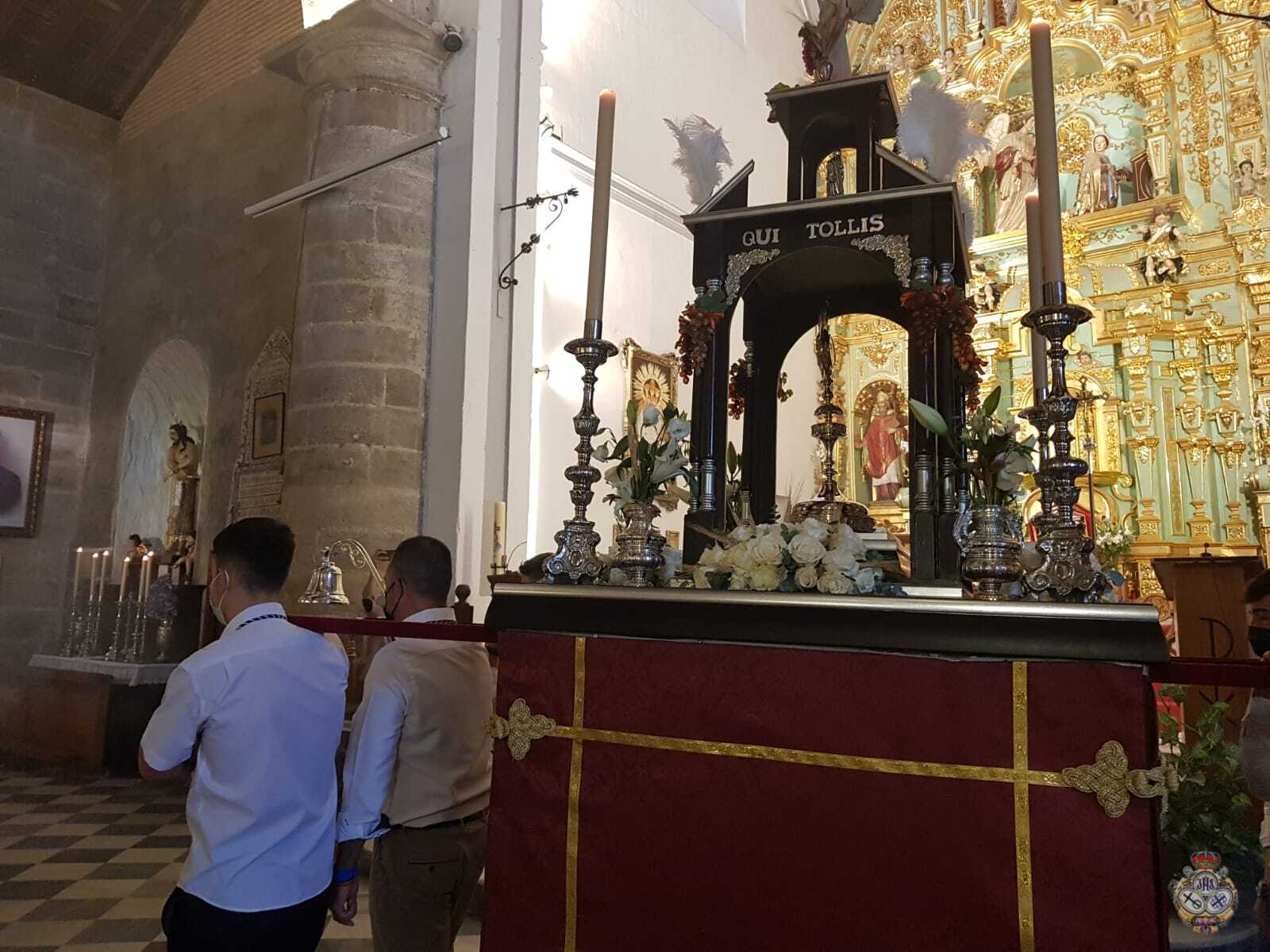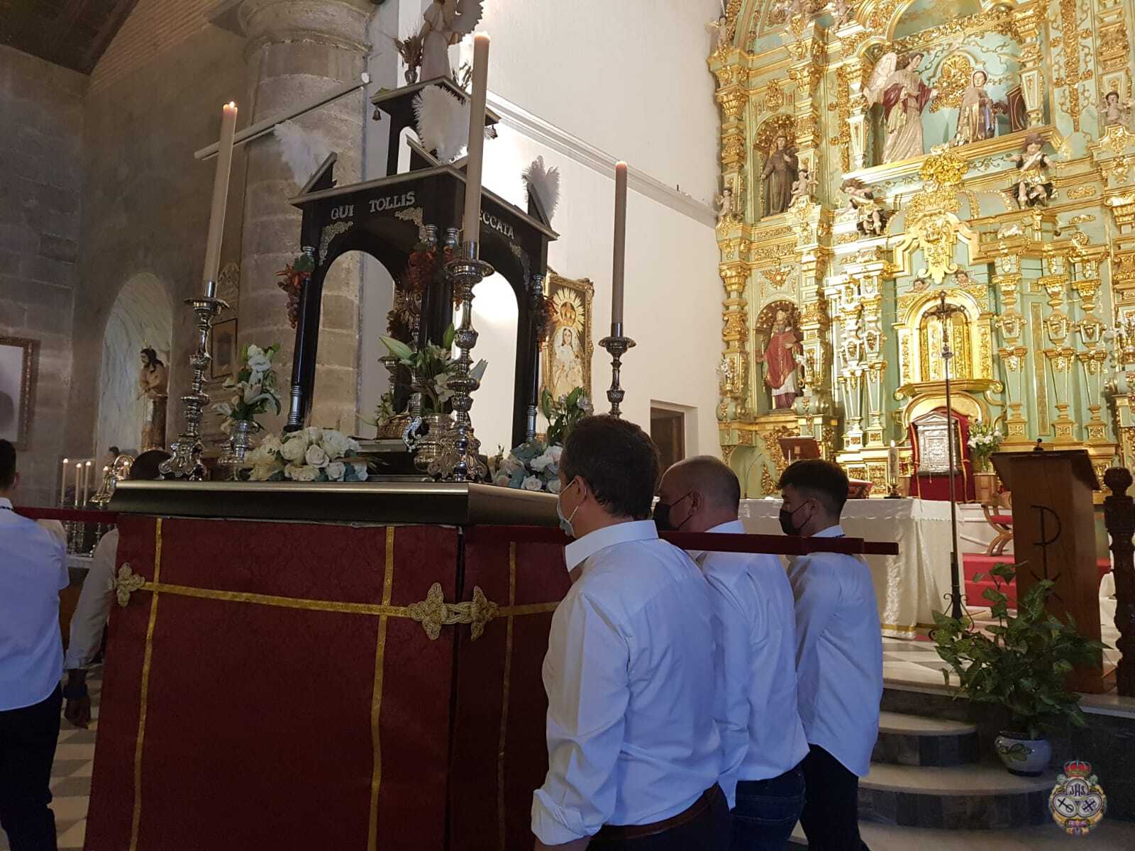El equipo de albacería de la Hermandad de Nuestra Señora de Flores, han sido los responsables de preparar y adornar las andas, mientras que los portadores han sido de la Sección del Santísimo Cristo Crucificado de los Estudiantes.